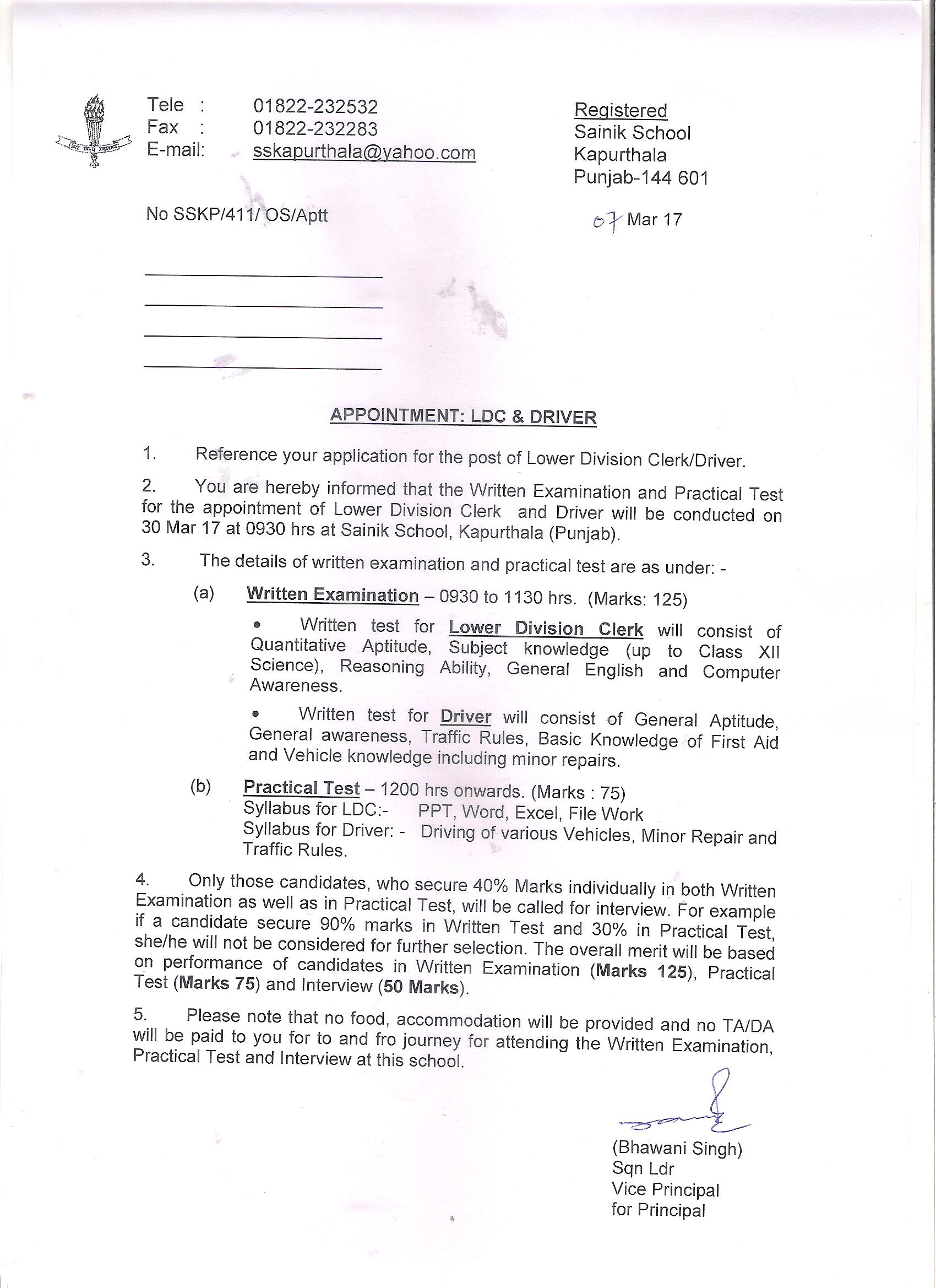 Sainik School, Kapurthala has released call letter for attending written test and practical test for the posts of Lower Division Clerk & Driver.