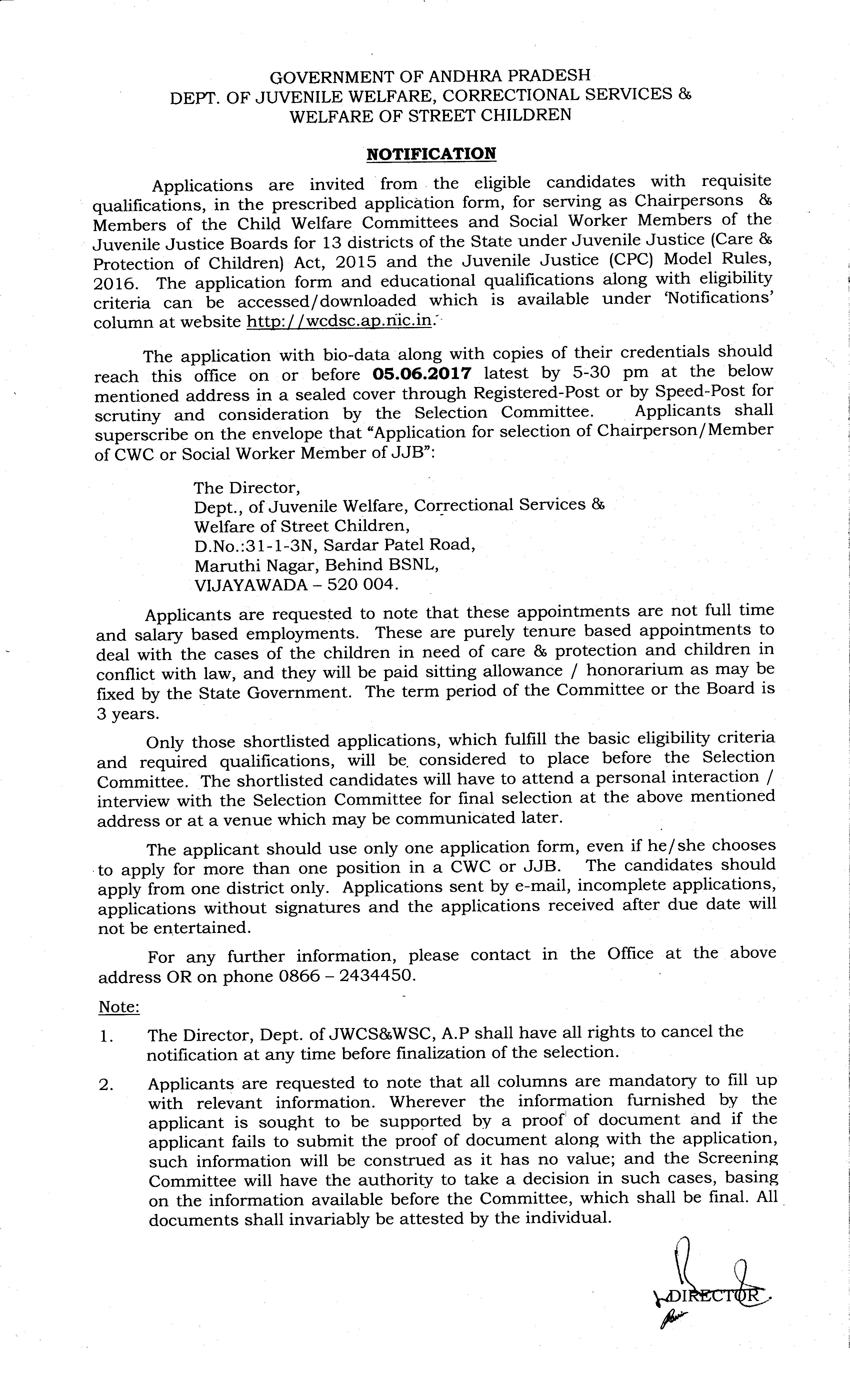 Recruitment Notification for serving as Chairpersons & Members of the Child Welfare Committees and Social worker members of the Juvenile Justice Boards for 13th districts of AP State.